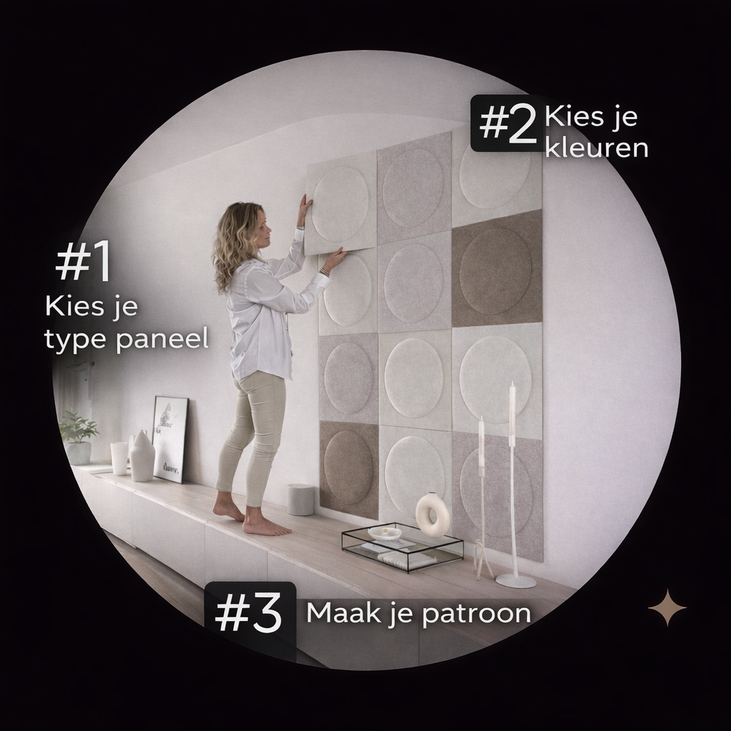 De Kracht van Wallfelt is het speelse modulaire karakter. Iedereen kan zijn eigen kleuren kiezen en patroon maken en ook weer veranderen. Het paneel is zelfklevend, papier eraf en plakken maar. Gemakkelijk en snel resultaat.
