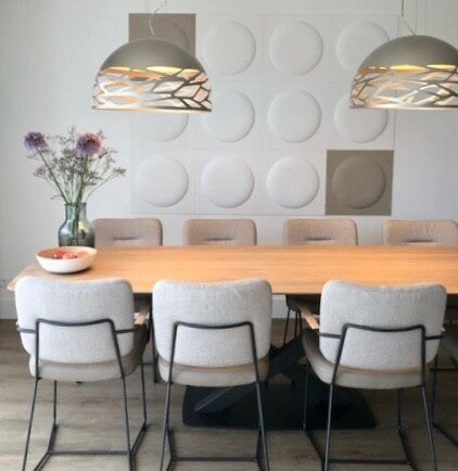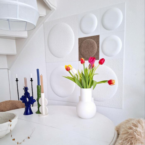 Het paneel heeft op de achterzijde een markering. De bouclé stof heeft een vezelrichting. Als de panelen niet in dezelfde richting liggen dan treedt er een kleurverschil op. Door de panelen met de markering steeds in dezelfde hoek te leggen, bijvoorbeeld linksonder, treedt er geen kleurverschil op.