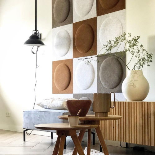 Het 25x25cm paneel heeft op de achterzijde een markering. Vilt heeft een vezelrichting. Als de panelen niet in dezelfde richting liggen dan treedt er een kleurverschil op. Door de panelen met het logo steeds in dezelfde hoek te leggen, bijvoorbeeld linksonder, treedt er geen kleurverschil op.