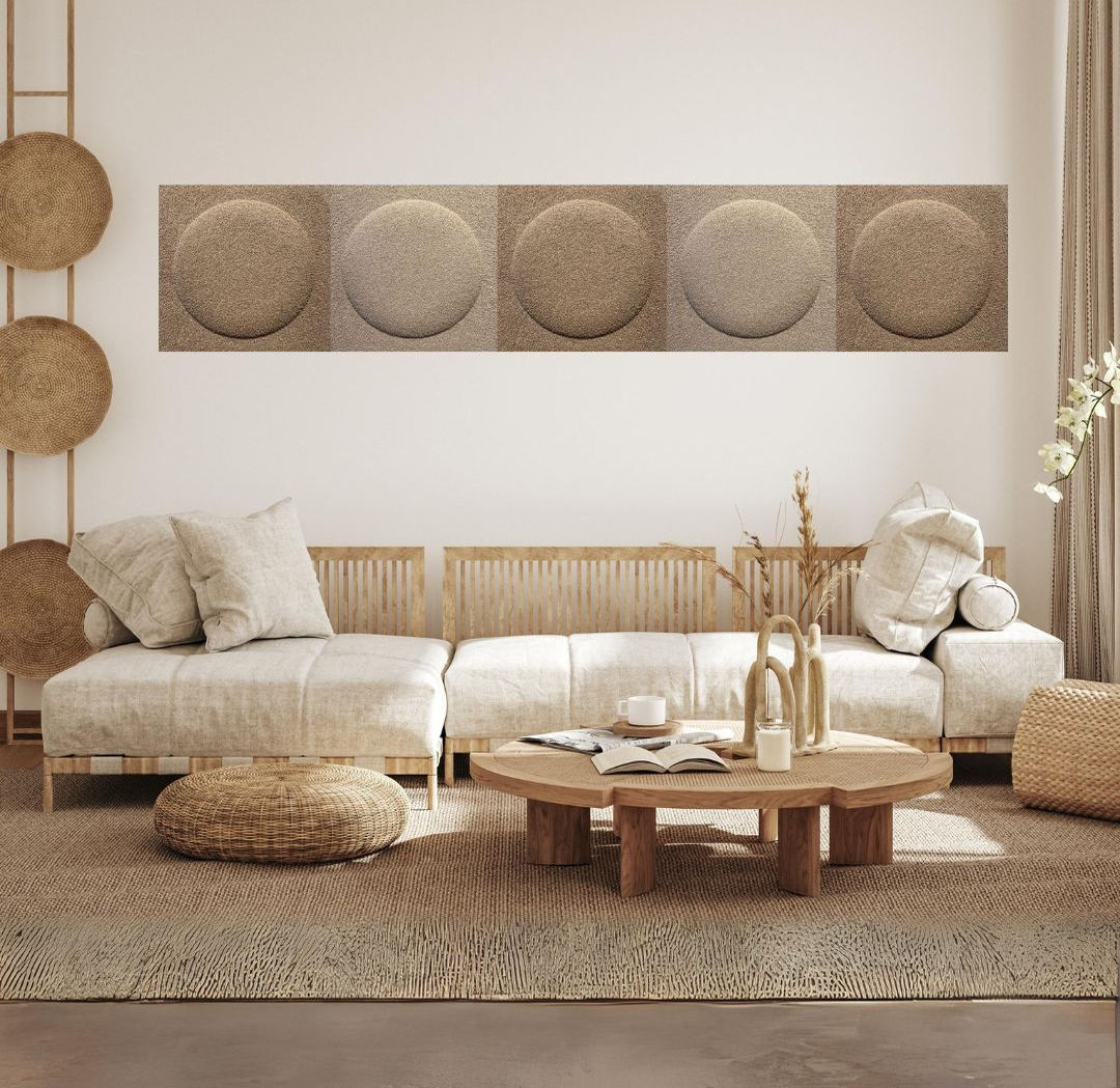 Ik ben een paneel van 50x50cm. In mijn midden zit een grote bol van 40cm, die 2cm naar voren steekt. Ik absorbeer geluid. Dus als je op zoek bent naar een minimalistisch design met een efficiënte akoestiek, ben ik de juiste keuze.